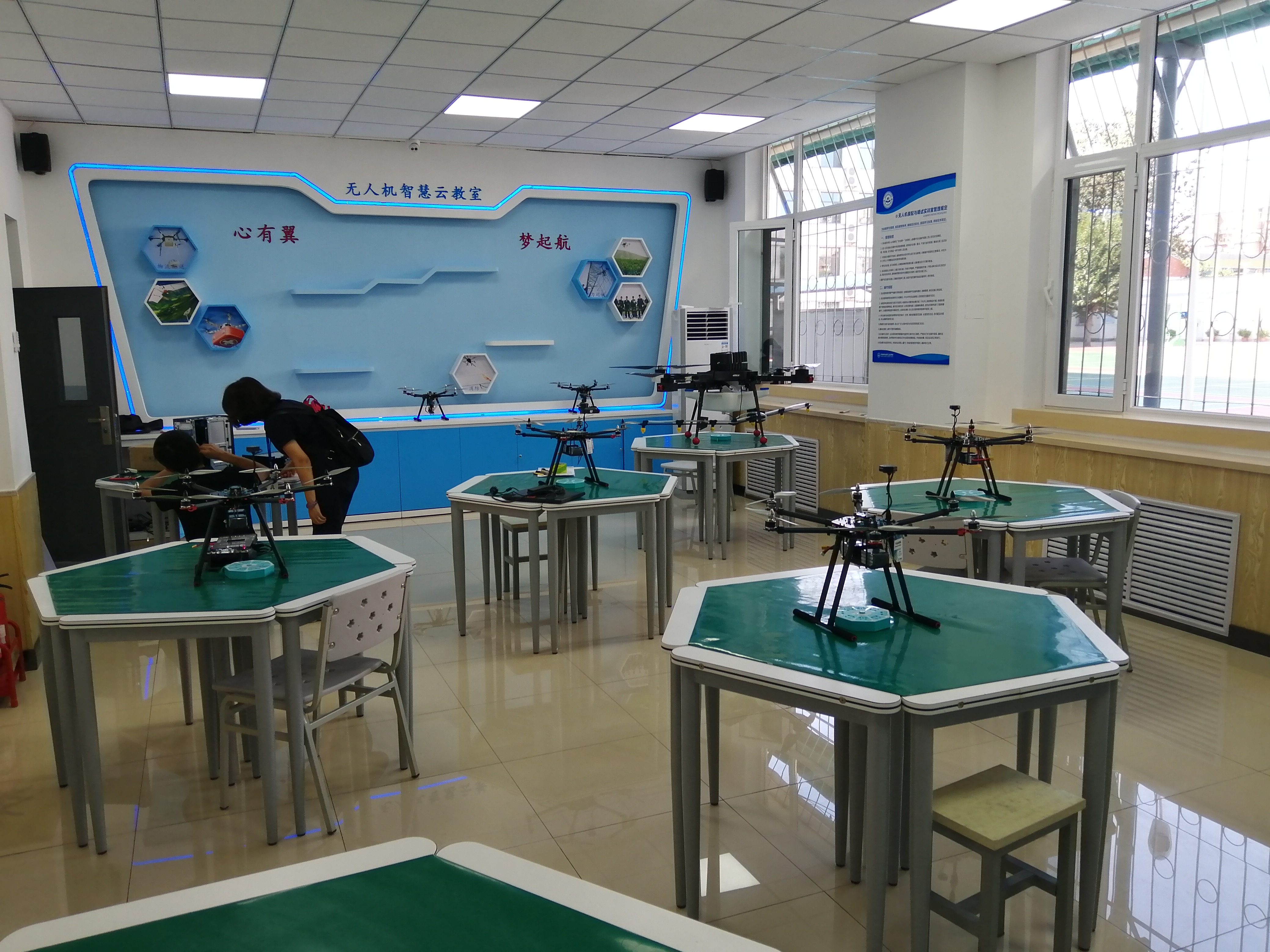 學校無人機智慧云實訓室建立于2020年下半年,設備包含小型拆裝實訓無人機、小型六旋翼實訓無人機、八旋翼電子執(zhí)照考證無人機、農用植保教學無人機、程控教學編程無人機,可滿足基礎拆裝、植保噴灑、電子執(zhí)照考證等教學內容,目前師資培訓已完成,實訓室已投放使用。