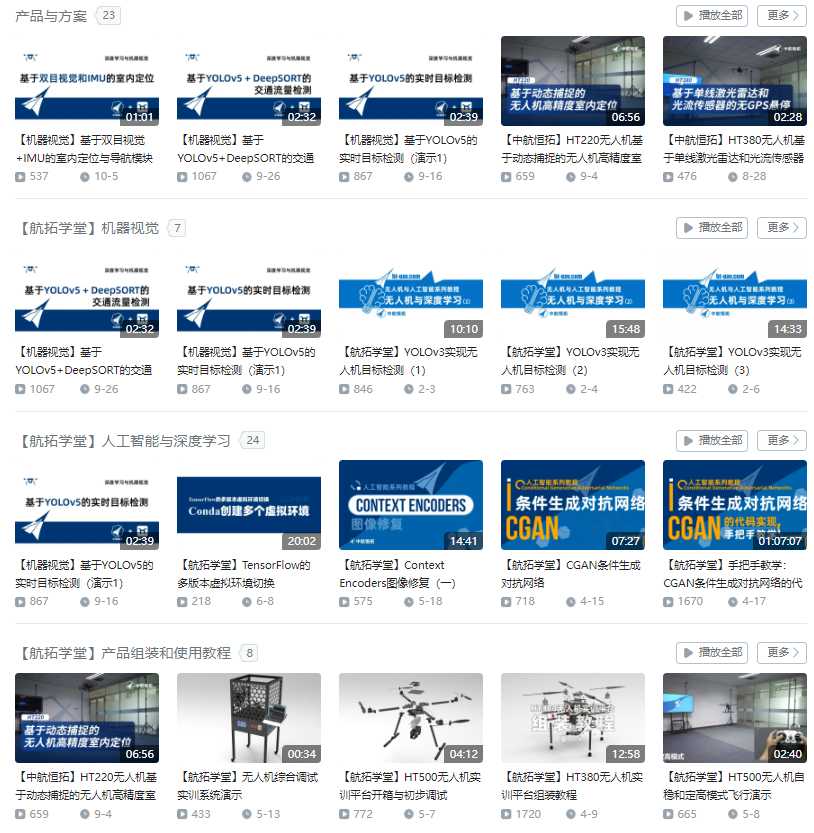 近日,中航恒拓推出了面向無(wú)人機(jī)職業(yè)教育的在線(xiàn)教學(xué)平臺(tái)——航拓學(xué)堂。航拓學(xué)堂課程內(nèi)容豐富,難度由淺入深,非常適合初學(xué)者和職業(yè)院校學(xué)生學(xué)習(xí)使用,主要課程不僅包括無(wú)人機(jī)相關(guān)原理、裝配與調(diào)試,還包括機(jī)械設(shè)計(jì)、電路設(shè)計(jì)以及算法、編程等方面的內(nèi)容,可以動(dòng)手制作無(wú)人機(jī),編寫(xiě)相關(guān)軟件。另外,無(wú)人機(jī)也是人工智能的重要應(yīng)用場(chǎng)景,將人工智能技術(shù)與無(wú)人機(jī)技術(shù)相結(jié)合,擁有廣闊的市場(chǎng)前景,課程還加入了部分人工智能、機(jī)器學(xué)習(xí)、機(jī)器視覺(jué)相關(guān)內(nèi)容,開(kāi)拓學(xué)生視野,對(duì)學(xué)有余力的學(xué)生可以提升綜合實(shí)力。職業(yè)院校可以通過(guò)集成在大屏中的軟件觀(guān)看視頻,還可以通過(guò)嗶哩嗶哩平臺(tái)試看部分內(nèi)容。