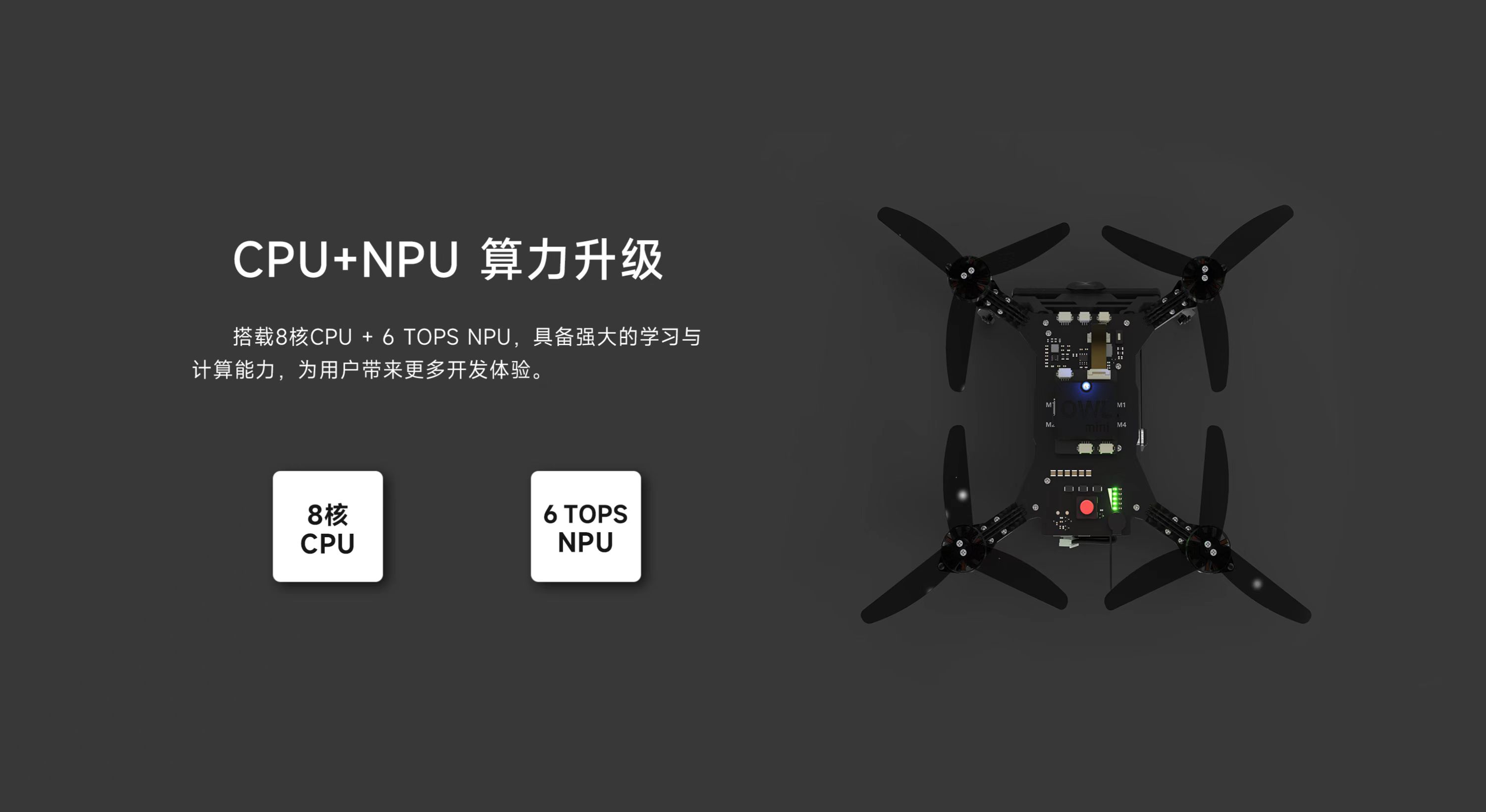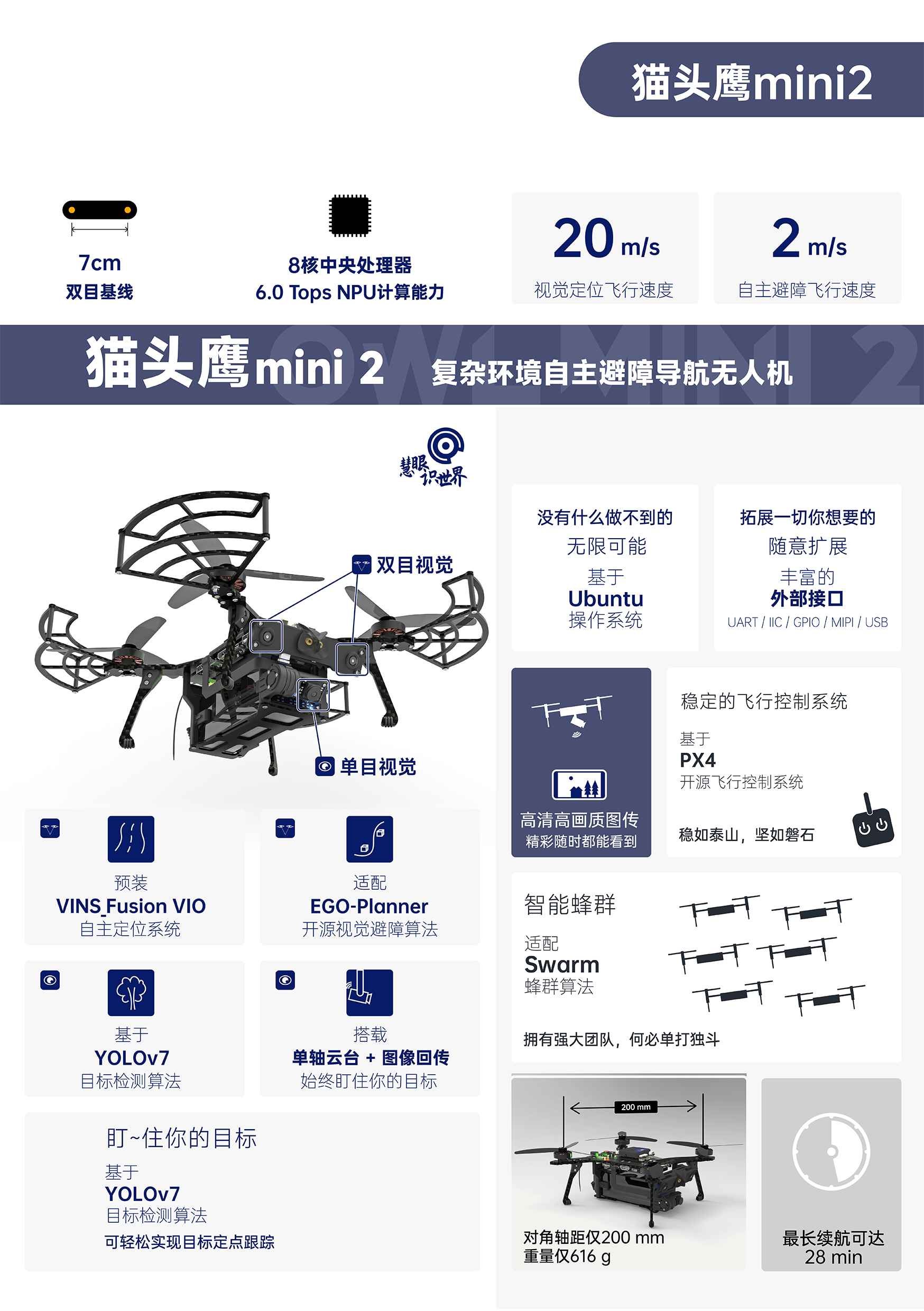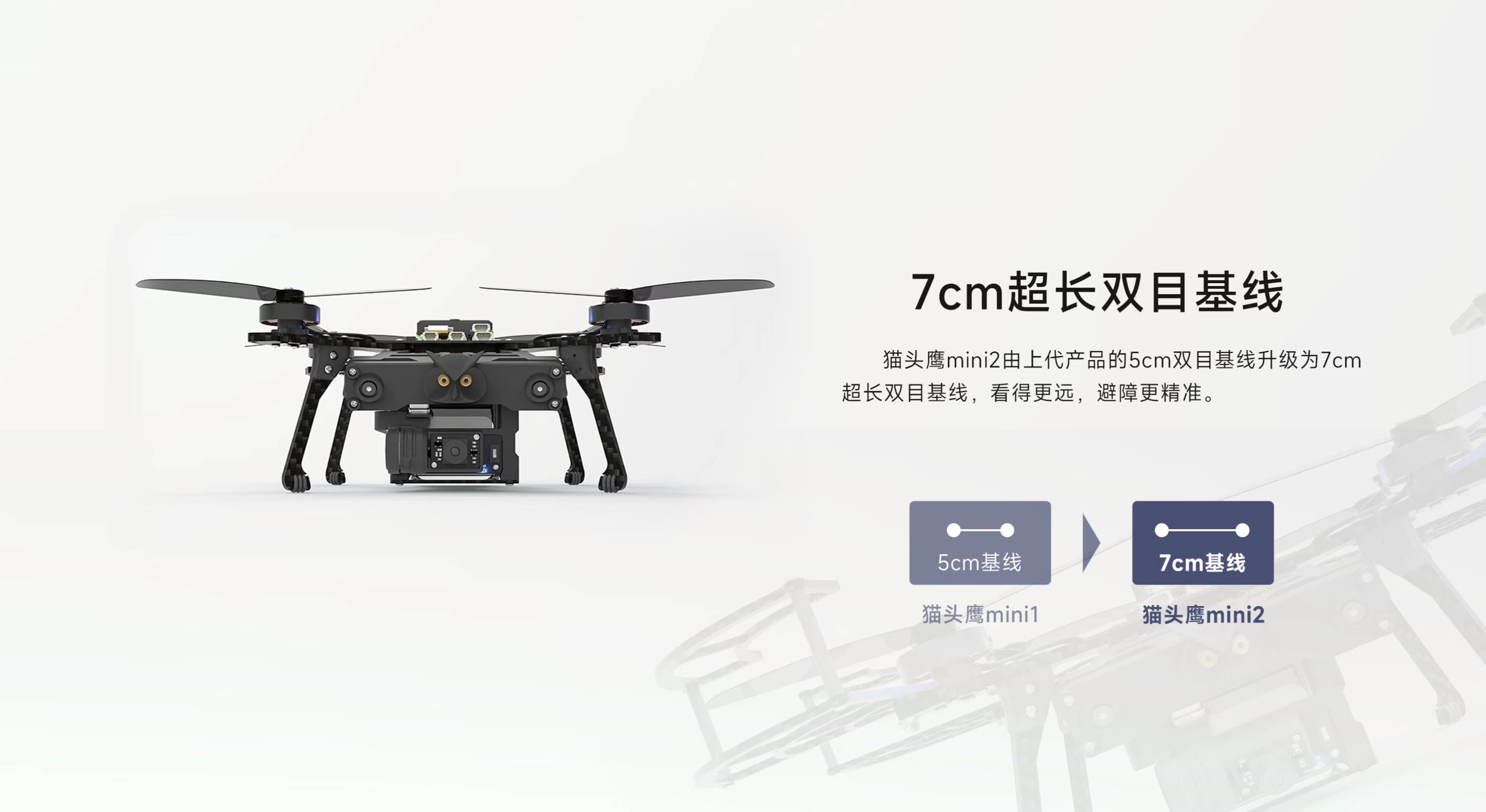 AI視覺無人機(jī)蜂群開發(fā)平臺貓頭鷹mini 2,為教育/科研而升級。軸距200mm,整備質(zhì)量617g,續(xù)航28min,視覺定位飛行速度達(dá)20m/s,自主避障飛行速度達(dá)2m/s。自主研發(fā)雙目視覺,搭載國產(chǎn)機(jī)載計(jì)算機(jī),算法升級,更穩(wěn),更準(zhǔn),更快,更智能;搭載8核處理芯片和6 TOPS NPU,具備強(qiáng)大的學(xué)習(xí)與計(jì)算能力,為用戶帶來更多開發(fā)體驗(yàn);搭載微型增穩(wěn)云臺,適配YoLo V7目標(biāo)檢測算法,可輕松實(shí)現(xiàn)目標(biāo)定點(diǎn)跟蹤;云臺攝像支持機(jī)載高清高畫質(zhì)編碼錄制,同步支持低延遲視頻圖像傳傳輸功能;新增無人機(jī)模擬仿真器VISIM,適用無人機(jī)單機(jī)控制、路徑規(guī)劃、集群、蜂群等算法仿真驗(yàn)證,可以極大提升貓頭鷹無人機(jī)功能研發(fā)、測試的效率和安全性。