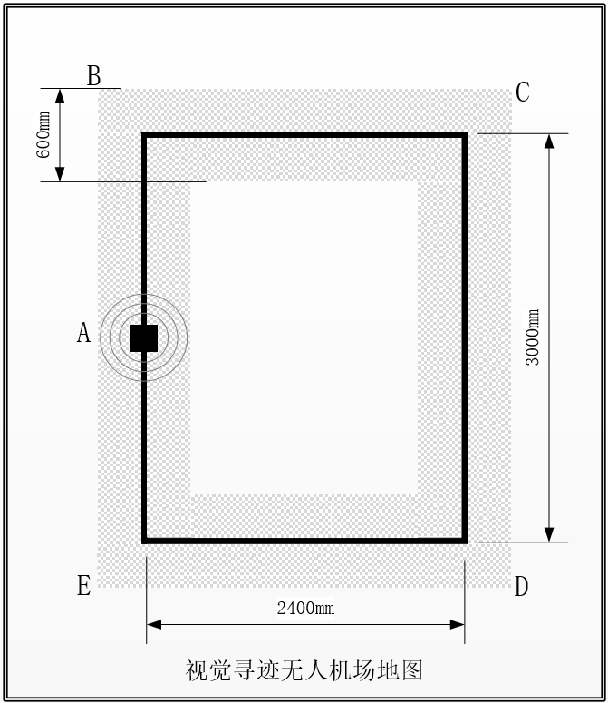 無人機放置A區(qū)域中心處,操作手操控遙控器或者地面站“一鍵起飛”按鈕,無人機從A區(qū)自主起飛到0.7M-1M高度,勻速飛行經(jīng)過B-C-D-E直線和直角彎區(qū)域,到達A區(qū)自主降落。飛行全程由無人機自主控制完成,無需操作手干預。
