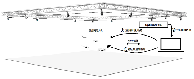 整個(gè)過(guò)程可簡(jiǎn)化為:計(jì)算機(jī)通過(guò)WIFI、藍(lán)牙或無(wú)線(xiàn)數(shù)傳等數(shù)據(jù)傳輸模塊輸出飛行控制指令給無(wú)人機(jī),無(wú)人機(jī)接收到飛行指令后自主飛行。運(yùn)動(dòng)捕捉系統(tǒng)實(shí)時(shí)捕捉到無(wú)人機(jī)的六自由度信息,并傳回控制計(jì)算機(jī)??刂朴?jì)算機(jī)根據(jù)預(yù)設(shè)的飛行軌跡和實(shí)際的飛行軌跡的差別,修正飛行參數(shù),并重新發(fā)送飛行控制指令給無(wú)人機(jī),從而控制無(wú)人機(jī)高精度的、平穩(wěn)的、無(wú)偏差的飛行。