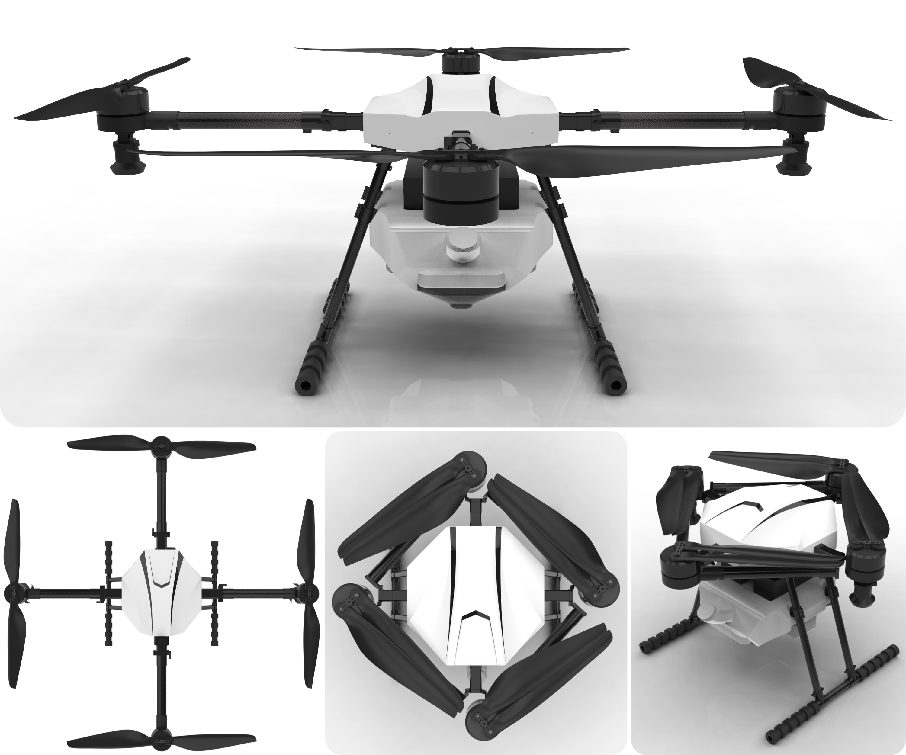 1、機(jī)架:機(jī)身采用四旋翼X型碳纖維結(jié)構(gòu),對(duì)角軸距1000mm,機(jī)身尺寸800mm*800mm*600mm,機(jī)臂采用可折疊設(shè)計(jì),上下板采用碳纖維設(shè)計(jì);