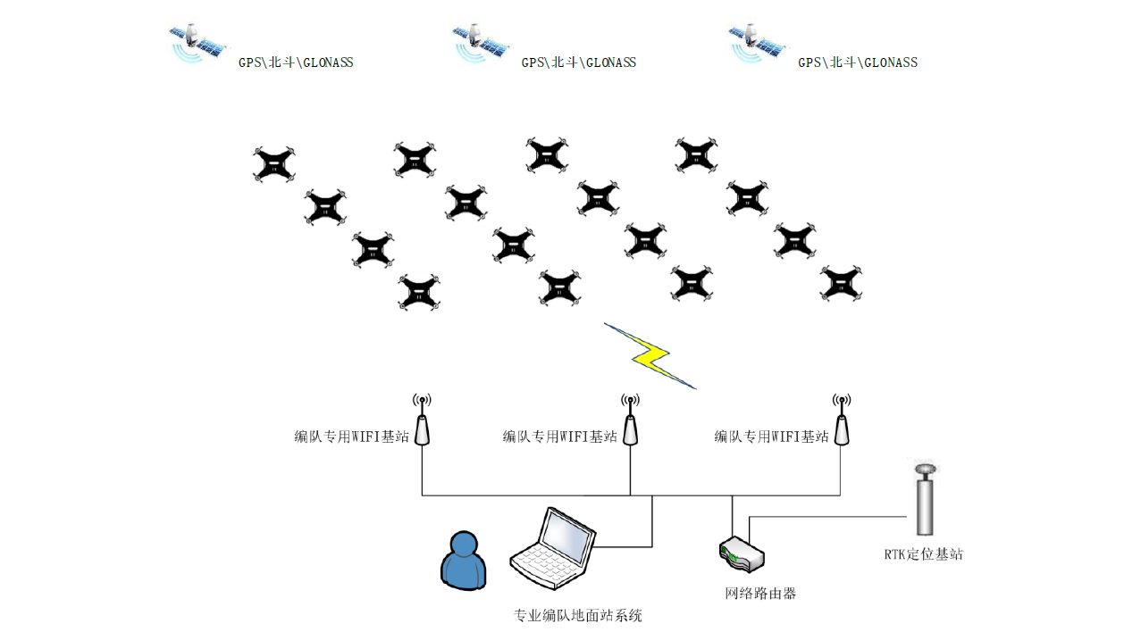 無人機編隊采用大規(guī)模WIFI連接實現(xiàn)數(shù)據(jù)鏈路,無人機通過GPS/RTK 等衛(wèi)星定位技術確定自身位置,地面控制系統(tǒng)有一套智能高效的無人機編隊遠程操控系統(tǒng),同一時間告訴每一架飛機位置在哪、往哪里飛、隊列如何切換等。